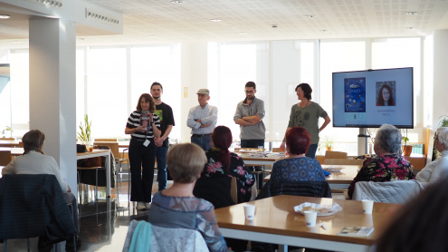 Més de trenta persones van omplir la Sala Gran per unir-se a la trobada. Amb un cafè o un suc de fruita i unes galetes, va començar la trobada de la mà de l'Anna Colominas, el Jesús García, Pau Rodríguez i Oriol García, membres de l'Associació Tintablava, que té residència al Centre Cívic.
