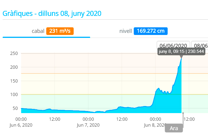 Gràfica de l'ACA que mostra el creixement del cabal del riu Llobregat al seu pas per Sant Joan Despí.