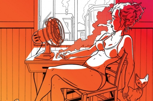 Aquesta il·lustració la vaig realitzar fa anys per un fanzine de Liverpool amb el títol Grrrls in Their Underwear. La temàtica de la publicació la marcava el mateix títol, havia de retratar una dona en roba interior. Em va vindre al cap la intimitat que es crea a casa, i la calor de la llar es va traspassar a la calor d’un dia d’estiu. I el resultat va ser aquest, un moment personal que es mostra al públic, però que manté la privacitat de no saber que està pensant.