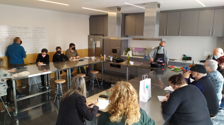 Cada dimecres al matí, una veïna o veí de la comunitat pratenca vindrà a la cuina de la Palmira per preparar el seu plat estrella en companyia de la resta del grup.