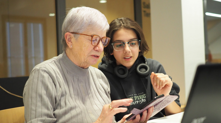 Activitat intergeneracional on el jovent aporta coneixements relacionats amb les noves tecnologies per trencar l'escletxa digital amb el col·lectiu de gent gran, donant així resposta a les seves necessitats.